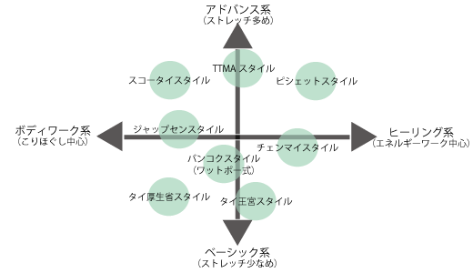 | ひとくちにタイ古式マッサージと言っても、そのスタイルは細分化されているようです。圧迫中心のベーシック系スタイルやストレッチ中心のアドバンス系スタイル。ボディケアに見られるコリほぐし中心のボディワークスタイルやヨガのようにエネルギーワークを意識したヒーリング系スタイルなど。ここでは、チャイチャイの独断と偏見によりスタイル別グラフを作成してみました。 |