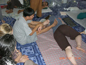 ピシェットスクールは学校と言うよりも、ピシェット道場とか、ピシェット寺院と表現したほうが、ふさわしいくらいの環境だ。決してカリキュラムがあってそれに沿って教えようなどということはない。マッサージの手技と言うより、密教の修行のような感じだ。ピシェット師の気分が乗らなければ生徒を全く相手にしないし、機嫌が良ければ(神が降臨してるときは)施術を見せるのだと言う。月~金曜日までやっているが、ほぼ年中無休の不定休営業。費用は日額800バーツ(3200円くらい)。ただしこれは、受講料ではなくお布施なのだ。1日800バーツで、通った分だけ支払うというシステムだ。ピシェット氏曰く、タイ語出来るなら1ヶ月、そうでなければ半年はいなさいとの事だ。